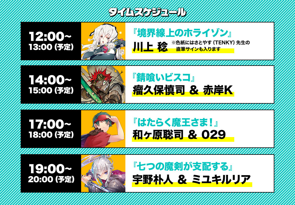 El evento comenzará con las franquicias literarias Kyoukaisenjou no Horizon (Horizon in the Middle of Nowhere)», «Sabikui Bisco (Rust-Eater Bisco)», «Hataraku Maou-sama! (The Devil is a Part-Timer!)» y «Nanatsu no Maken ga Shihai Suru (Reign of the Seven Spellblades).