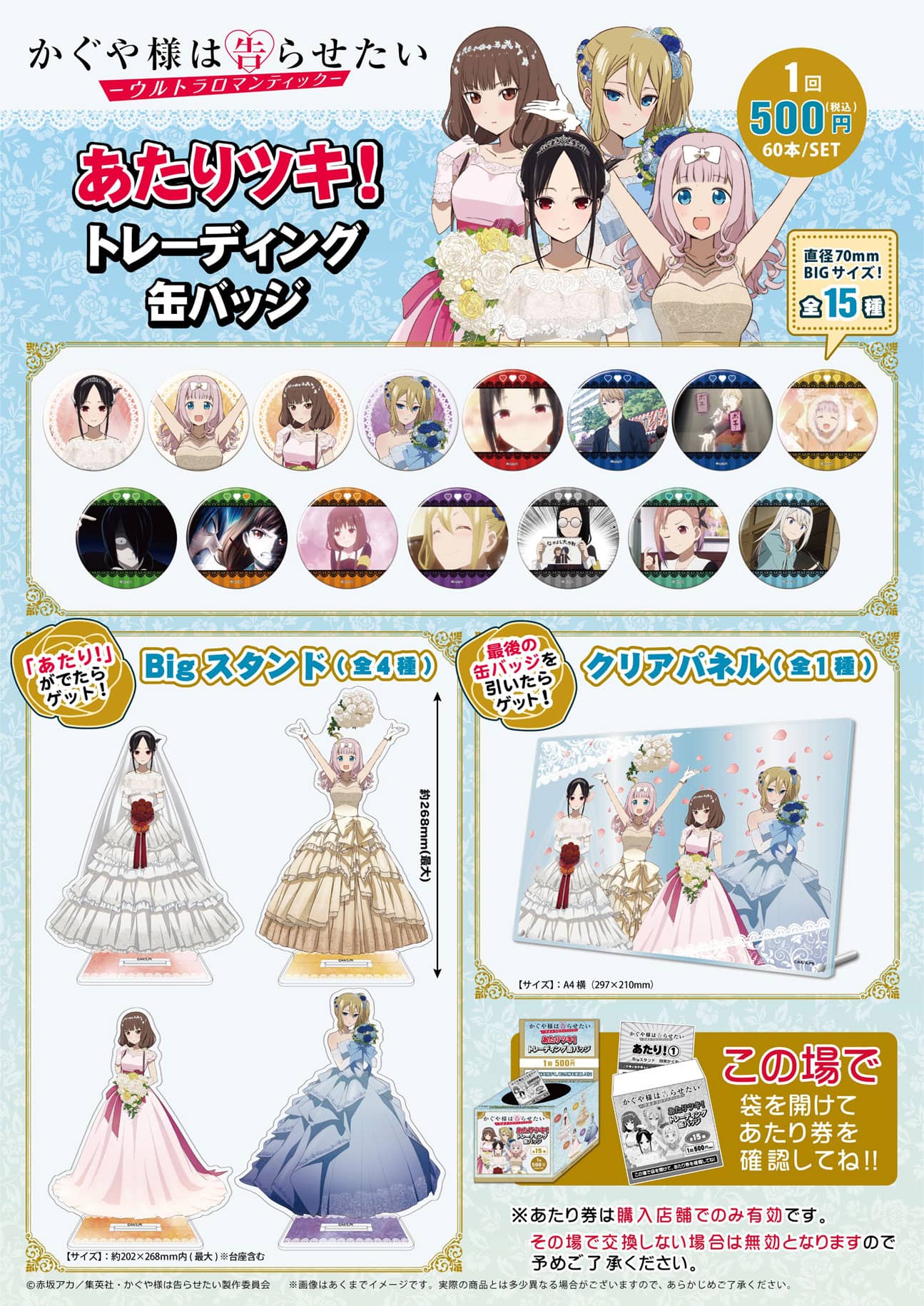 Adicionalmente, se confirmó que la colaboración entre Tsutaya y el anime Kaguya-sama: Love is War comenzará a partir del próximo 27 de agosto de este año. Como hemos mencionado anteriormente, la colaboración consistirá en la producción de unos productos inspirados en las chicas del anime Kaguya-sama: Love is War, quienes lucirán un encantador vestido de novia para la ocasión.