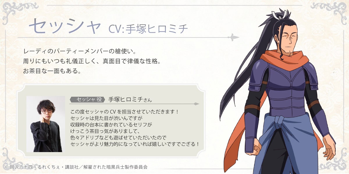 Además, en el sitio web oficial del anime Kaiko Sareta Ankoku Heishi (30-Dai) no Slow na Second Life presentó a los nuevos integrantes del elenco de voz que participará en la serie, los cuales son los siguientes: