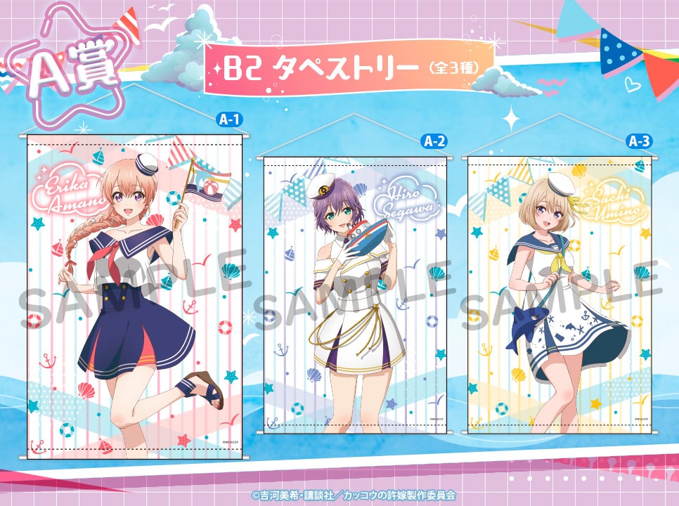 La colaboración entre la tienda «animate» y el anime Kakkou no Iinazuke comenzará a partir del 23 de septiembre hasta el próximo 23 de octubre de este año, en donde los productos inspirados en los personajes Erika Amano, Hiro Segawa y Sachi Umino podrán ser adquiridos en modo de premio por medio de un sorteo y algunos de los productos son los siguientes: