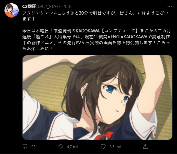 A través del Twitter Oficial, el circulo doujin y la compañía de producción C2 Kikan reveló que en la próxima edición de la revista Comptiq incluirá fotogramas del video promocional para la segunda temporada del anime Kantai Collection.