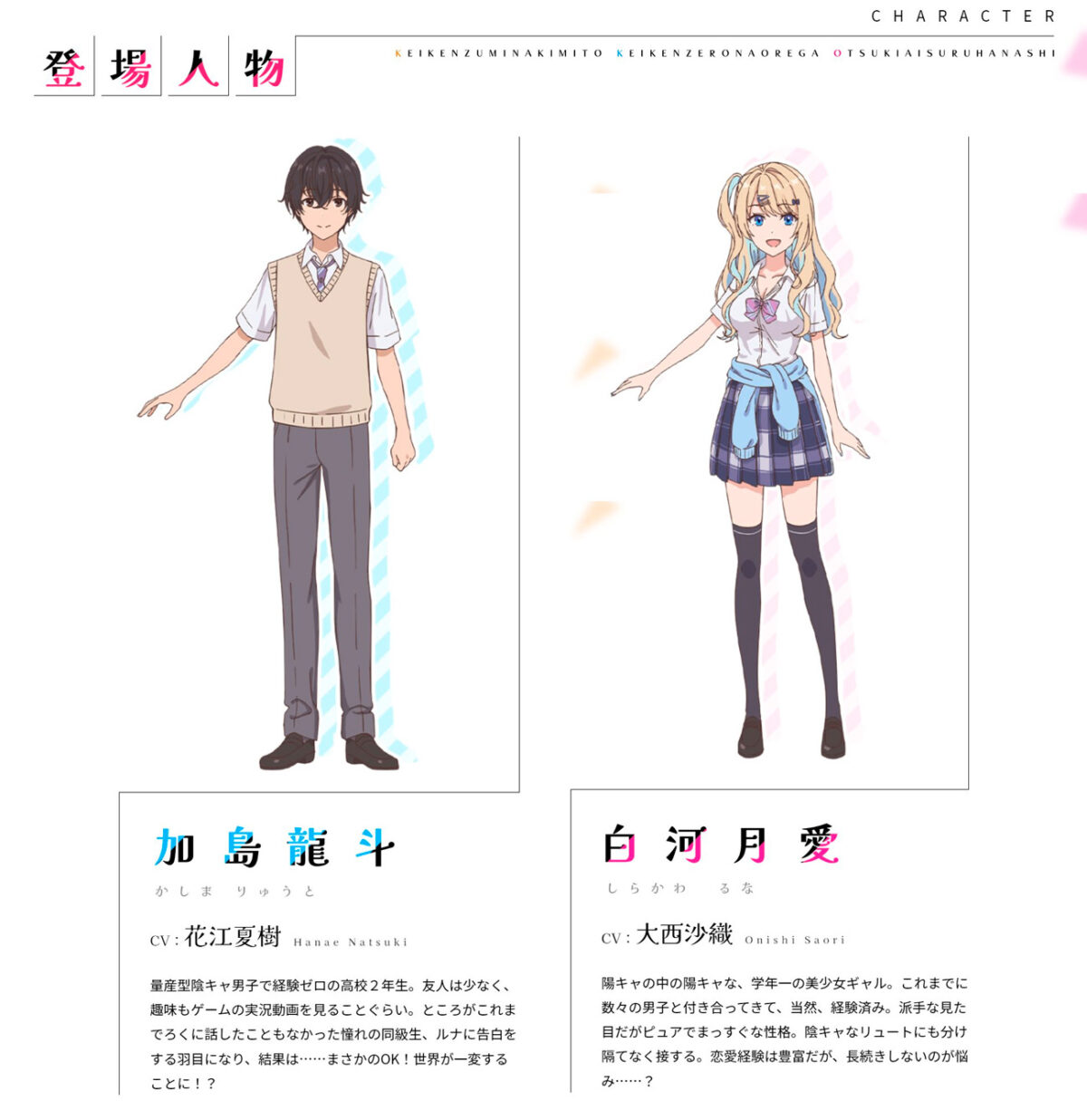 De manera adicional, el sitio web oficial del anime Keikenzumi na Kimi to, Keiken Zero na Ore ga, Otsukiai suru Hanashi presentó a los primeros integrantes del elenco de voz, quienes interpretaran a los protagonistas de la serie Ryuuto Kashima y Runa Shirakawa.