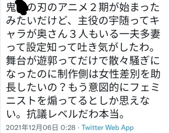 Parece que ha comenzado la segunda temporada del anime Kimetsu no Yaiba, pero me dieron ganas de vomitar cuando me enterรฉ de que el protagonista, Tengenย Uzui, tiene una poligamia con tres esposas. Se armรณ un gran revuelo solo por el hecho de estar ambientada en un burdel, sin embargo, ยฟQuieren los productores promover la discriminaciรณn hacia las mujeres? No puedo evitar pensar que estรกn tratando deliberadamente de agitar a las feministas. Es una protesta, en realidad.