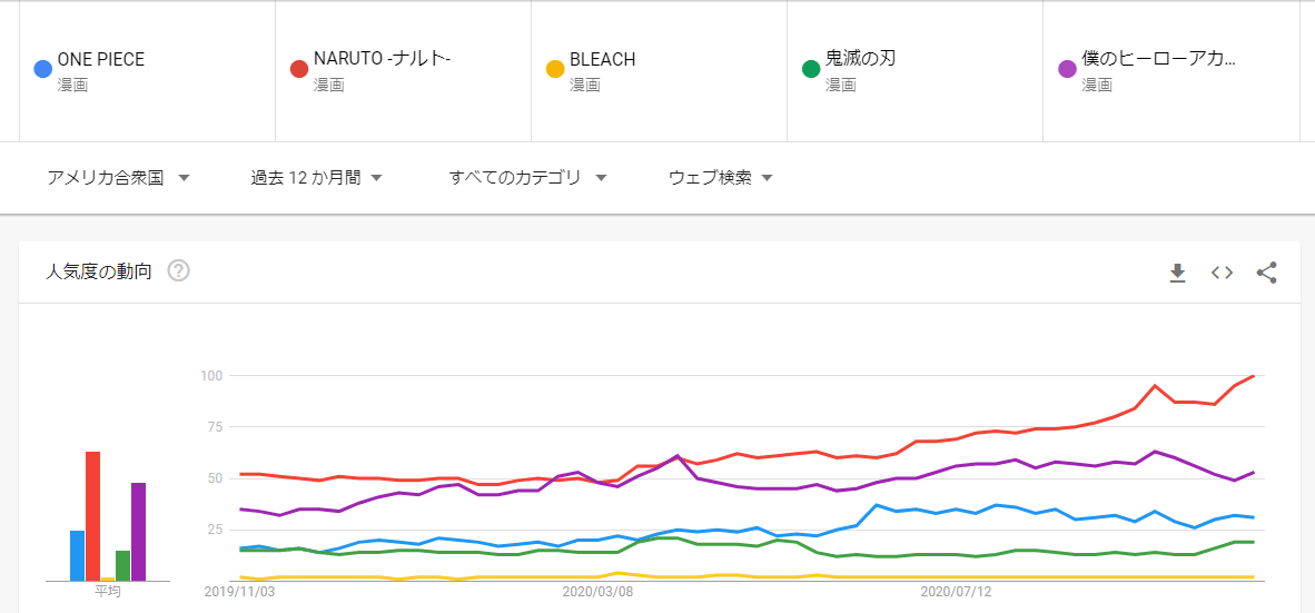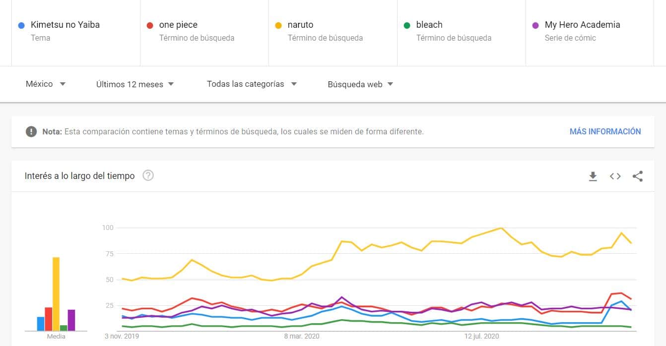 Nosotros queridos realizar el mismo experimento en Mรฉxico, revelando que Naruto se lleva la corona como el anime mas popular en el paรญs y con un gran margen de diferencia. Ademรกs, podemos ver como durante cortos periodos, Kimetsu logro igualarse en popularidad a Boku no Hero Academia.
