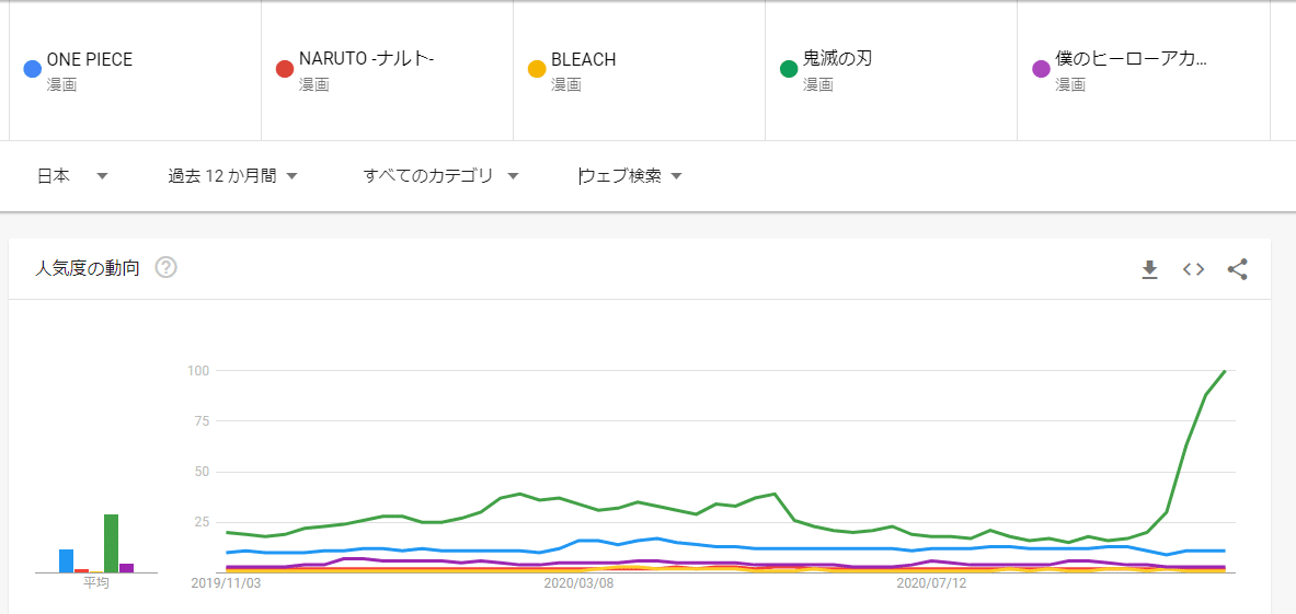 Nosotros queridos realizar el mismo experimento en Mรฉxico, revelando que Naruto se lleva la corona como el anime mas popular en el paรญs y con un gran margen de diferencia. Ademรกs, podemos ver como durante cortos periodos, Kimetsu logro igualarse en popularidad a Boku no Hero Academia.