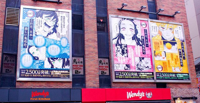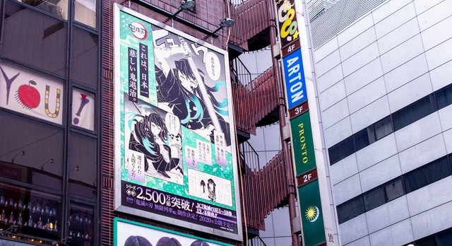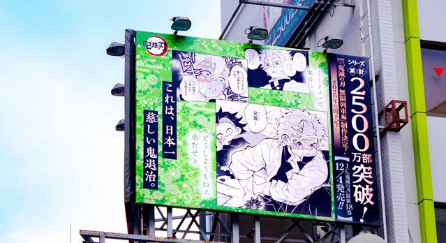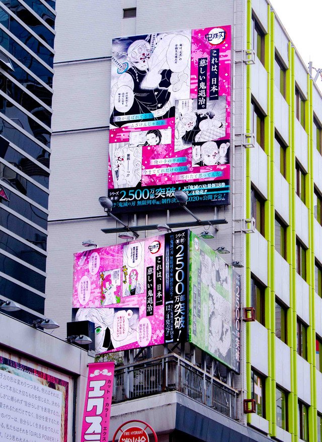 El manga Kimetsu no Yaiba con el lanzamiento de su volumen 18 alcanzó la increíble cifra de 25 millones de copias impresas (y probablemente vendidas). Colocando al manga como una de las más populares del momento, y para celebrarlo, se han colocado carteles con algunos momentos especiales del 18 volúmenes en todo el Centro Gai de Shibuya y áreas exteriores.