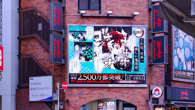 El manga Kimetsu no Yaiba con el lanzamiento de su volumen 18 alcanzó la increíble cifra de 25 millones de copias impresas (y probablemente vendidas). Colocando al manga como una de las más populares del momento, y para celebrarlo, se han colocado carteles con algunos momentos especiales del 18 volúmenes en todo el Centro Gai de Shibuya y áreas exteriores.