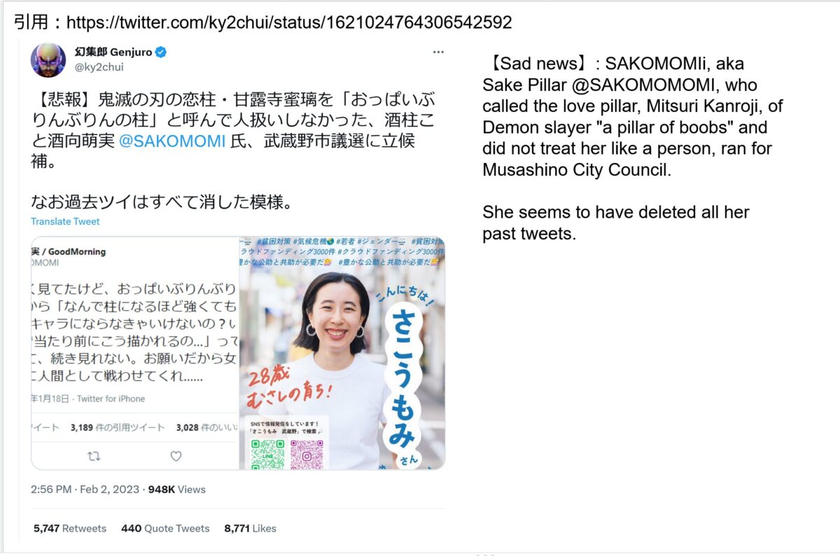 Esta mujer recientemente fue elegida como candidata en las elecciones de la ciudad de Musashino, motivo por el cual, el usuario rayforcegame hizo notar que la candidata borro una serie de tweets en donde lanza una dura crítica a la sexualización en Kimetsu no Yaiba. Aparentemente, este movimiento fue para no tener «mala fama» entre los fanáticos que podrían afectar su desempeño en campaña.