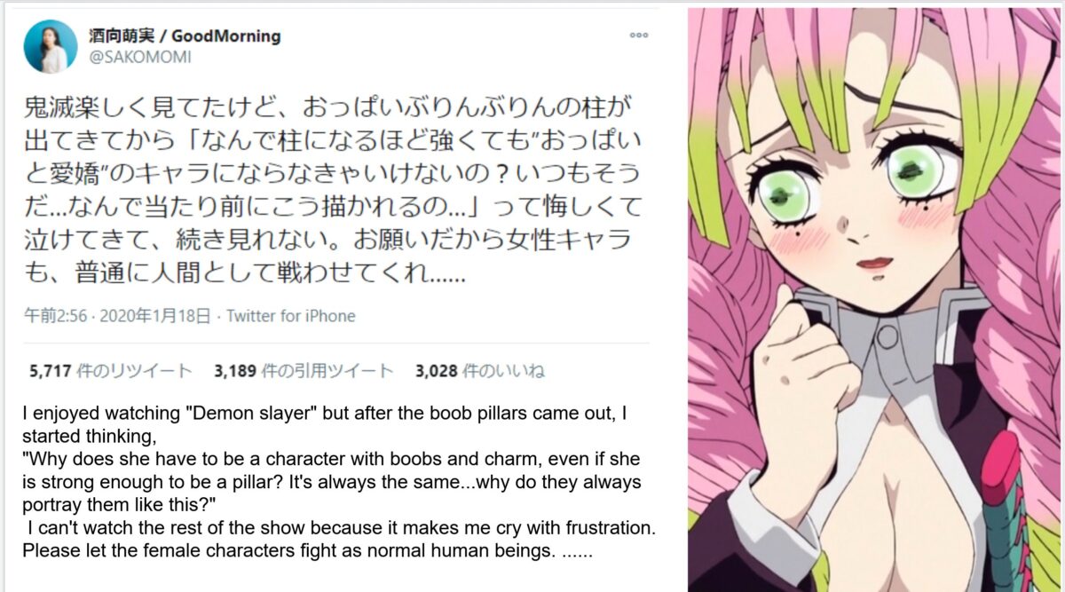 Disfruté mucho viendo «Kimetsu no Yaiba» pero después de la presentación del pilar de las tetas, empece a pensarlo. ¿Por qué siempre debe haber un personaje con enormes pechos y carisma, incluso si es lo suficientemente fuerte para ser un pilar? Siempre es lo mismo… ¿Por qué siempre deben retratar a alguien de esta forma? No pude ver el resto de la serie porque estaba llorando con frustración. Por favor, representen a los personajes femeninos como seres humanos normales.