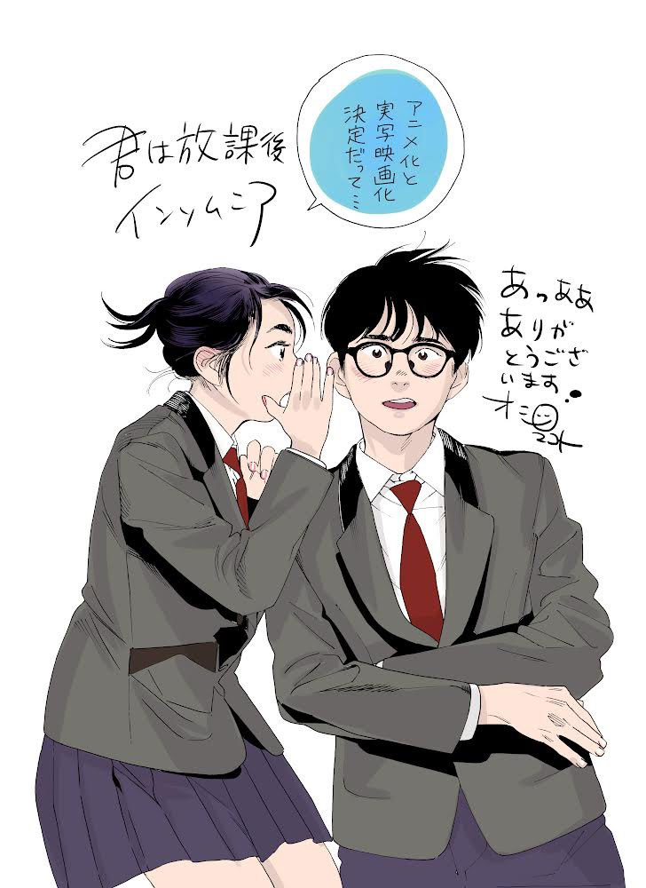 Según un reporte realizado en el Twitter oficial de la editorial Shogakukan, se anunció que el manga Kimi wa Houkago Insomnia (Insomniacs After School) tendrá una adaptación al anime, y de manera adicional, se confirmó la producción de una adaptación a película Live Action. Nuevos detalles se revelarán en el futuro.