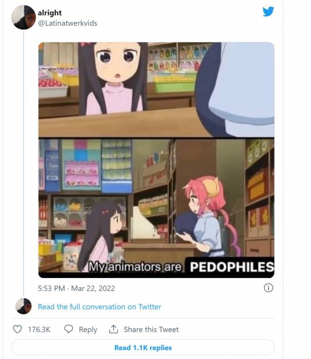 Estos son los tweets originales publicados por el usuario y una respuesta a su tweet, quien afirma decir que los animadores de Kyoto Animation son pedรณfilos gracias al tipo de contenido que generan, en este caso por el tamaรฑo del pecho de Ilulu. Actualmente, este tweet tiene 176 K de likes, 1.1 K de respuestas y 17 K en retweets dentro de la plataforma.