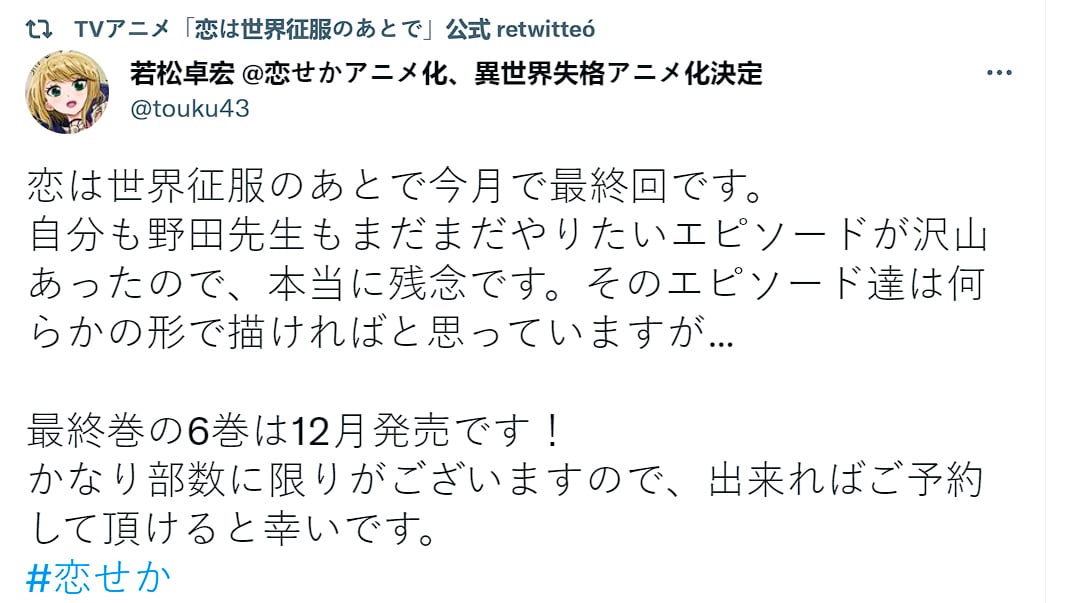 En el momento en que la editorial Kodansha anunció en la edición de noviembre de la revista «Monthly Shonen Magazine» que el manga Koi wa Sekai Seifuku no Ato de (Love After World Domination) llegaría a su final, muchas personas han empezado a lamentar esta triste noticia, y es que a pesar de que la obra no logró recaudar una buena cantidad de copias en el último tiempo, si es cierto que gracias a su adaptación al anime, el manga logró juntar una buena cantidad de seguidores en diferentes partes del mundo.