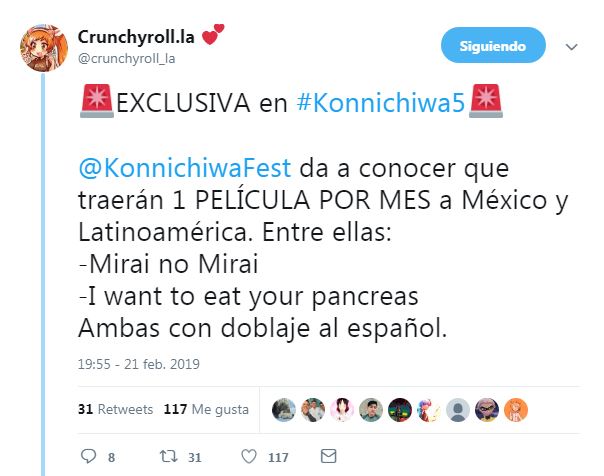 Por medio de su cuenta de Twitter el staff de Crunchyroll Latinoamerica revelo que Konnichiwa Festival estrenara una película anime por mes y entre la lista de películas se encuentra Mirai no Mirai y Kimi no Suizou o Tabetai, ambas contaran con doblaje al español.
