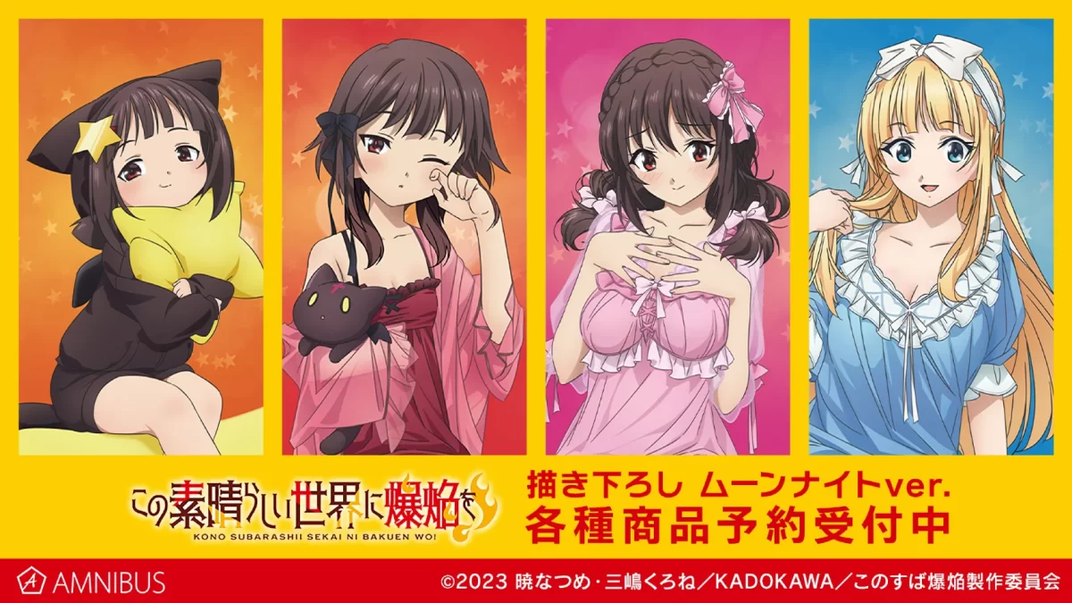 Esta colaboración entre el anime televisivo KonoSuba: An Explosion on This Wonderful World! y la compañia «AMNIBUS» está programada para comenzar el próximo 20 de diciembre de este año. Como hemos mencionado con anterioridad, para este evento especial se han preparado una considerable cantidad de productos que llevarán las ilustraciones de las chicas de la serie impresas en ellas.