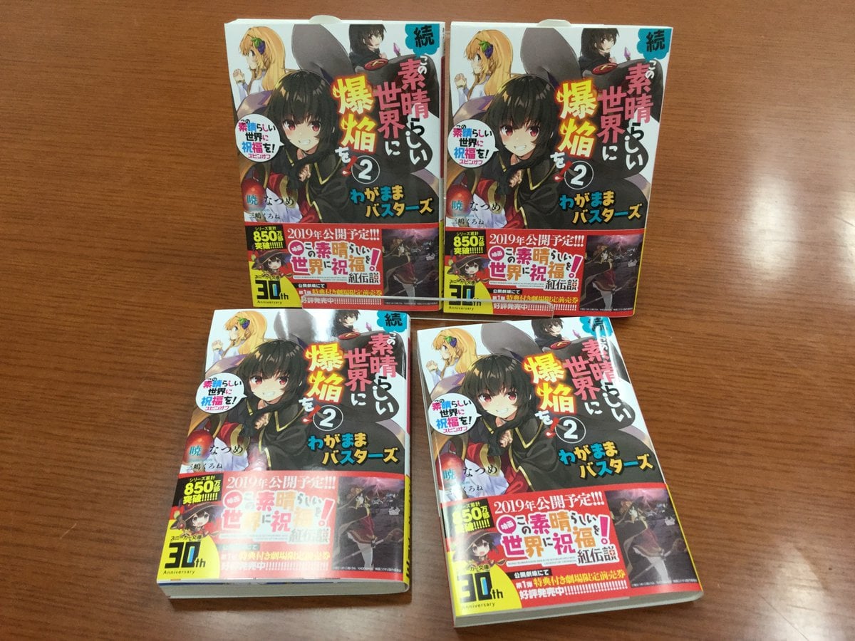 Recientemente se ha dado a conocer en el รบltimo tomo publicado de la novela ligera Kono Subarashii Sekai ni Shukufuku o!ย que la novela ha logrado vender mรกs de 8.5 millones de copias, previamente se habรญa publicado que la novela ligera habรญa llegado a las 6.5 millones de copias vendidas.