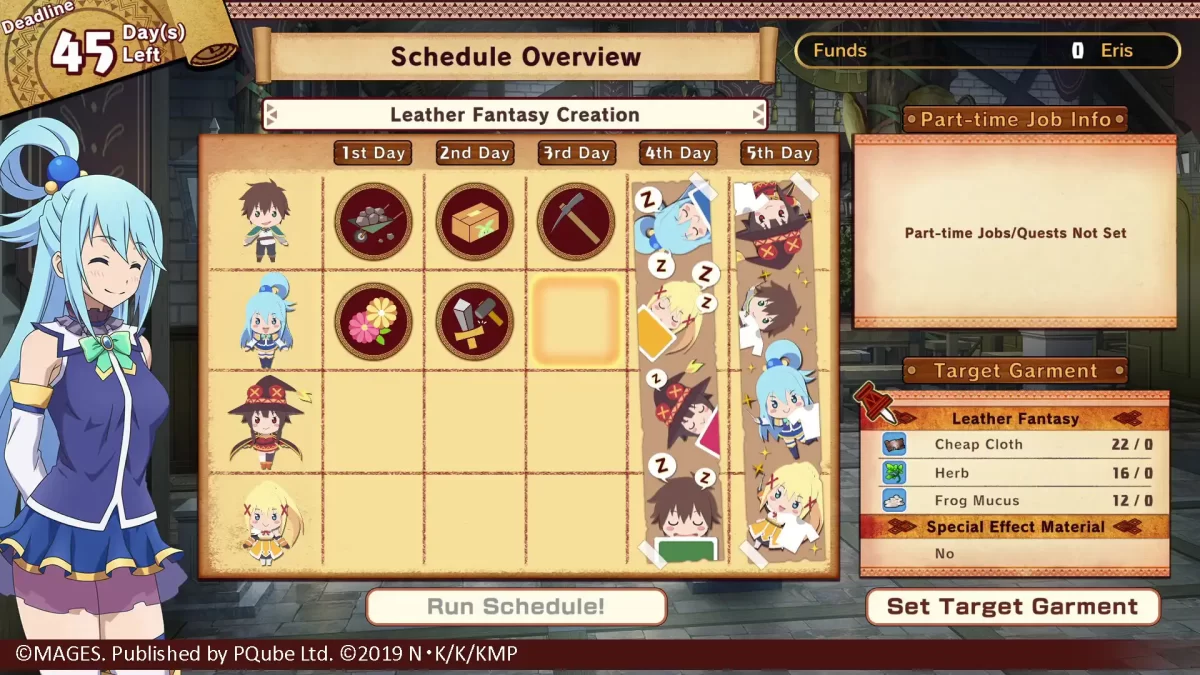 Tendrรกs un tiempo lรญmite para cumplir con el encargo principal y juntar materiales para crear la ropa que te pidan hacer, o si no el grupo de Kazuma serรก condenado a muerte, por lo que tendrรกs que manejar muy bien el tiempo que quieras invertir en conseguir materiales รบnicos para crear los mejores atuendos posibles y que las chicas puedan probรกrselos para darnos una imagen รบnica y refrescante de ellas mismas.