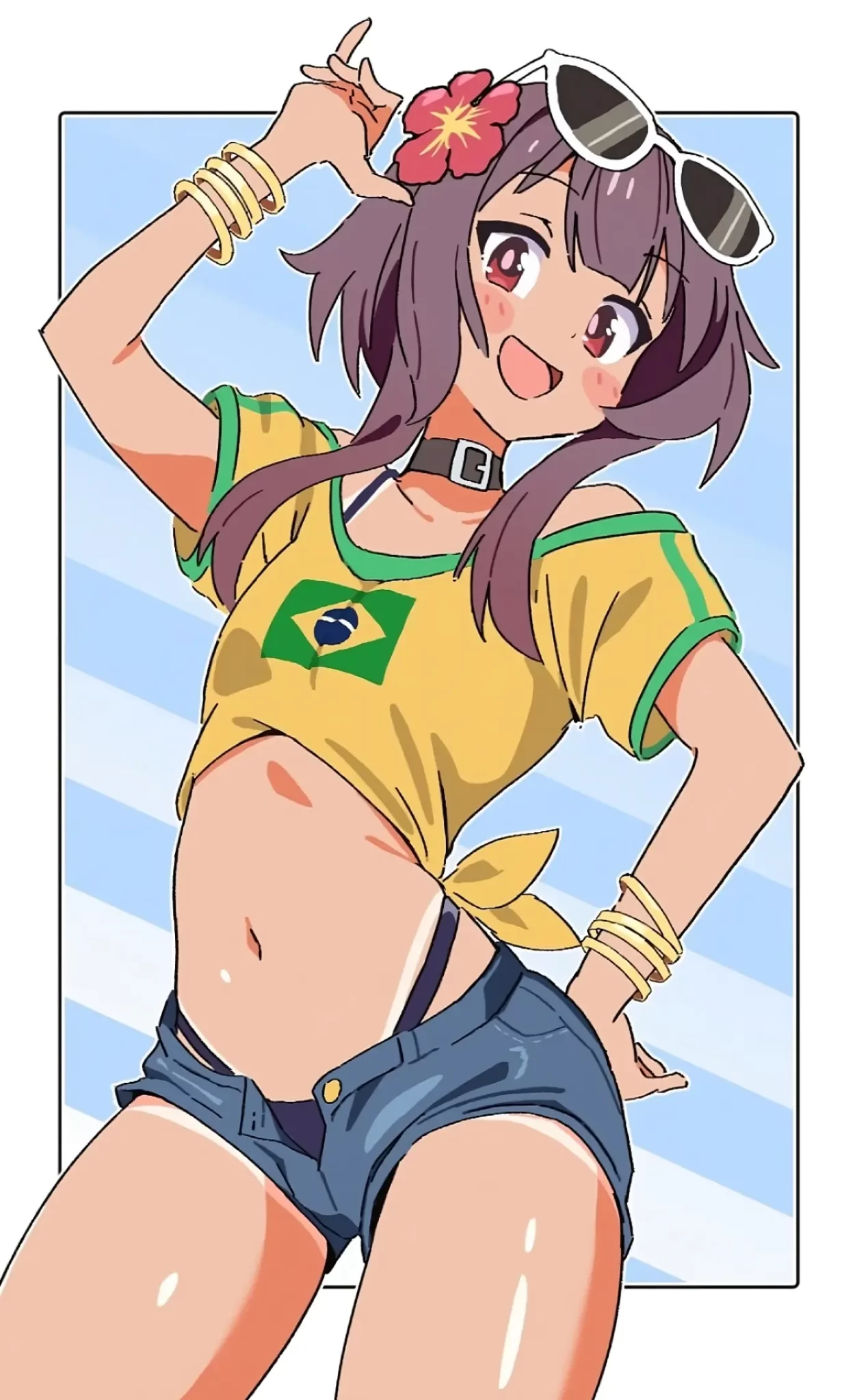 En cuanto a los accesorios que se encuentra utilizando Megumin en este atuendo, vemos que le dan un aspecto bastante fresco al personaje de lo visto en Konosuba!, se puede ver que utiliza en esta imagen su característico choker con un color un poco diferente de su diseño original. También podemos ver otros accesorios como los brazaletes de oro que combinan muy bien con su atuendo, los lindos lentes de sol para el clima de brasil que le dan un toque bastante fresco y la flor de su cabeza que complementa en todo su esplendor este outfit que sin duda se volverá bastante popular.