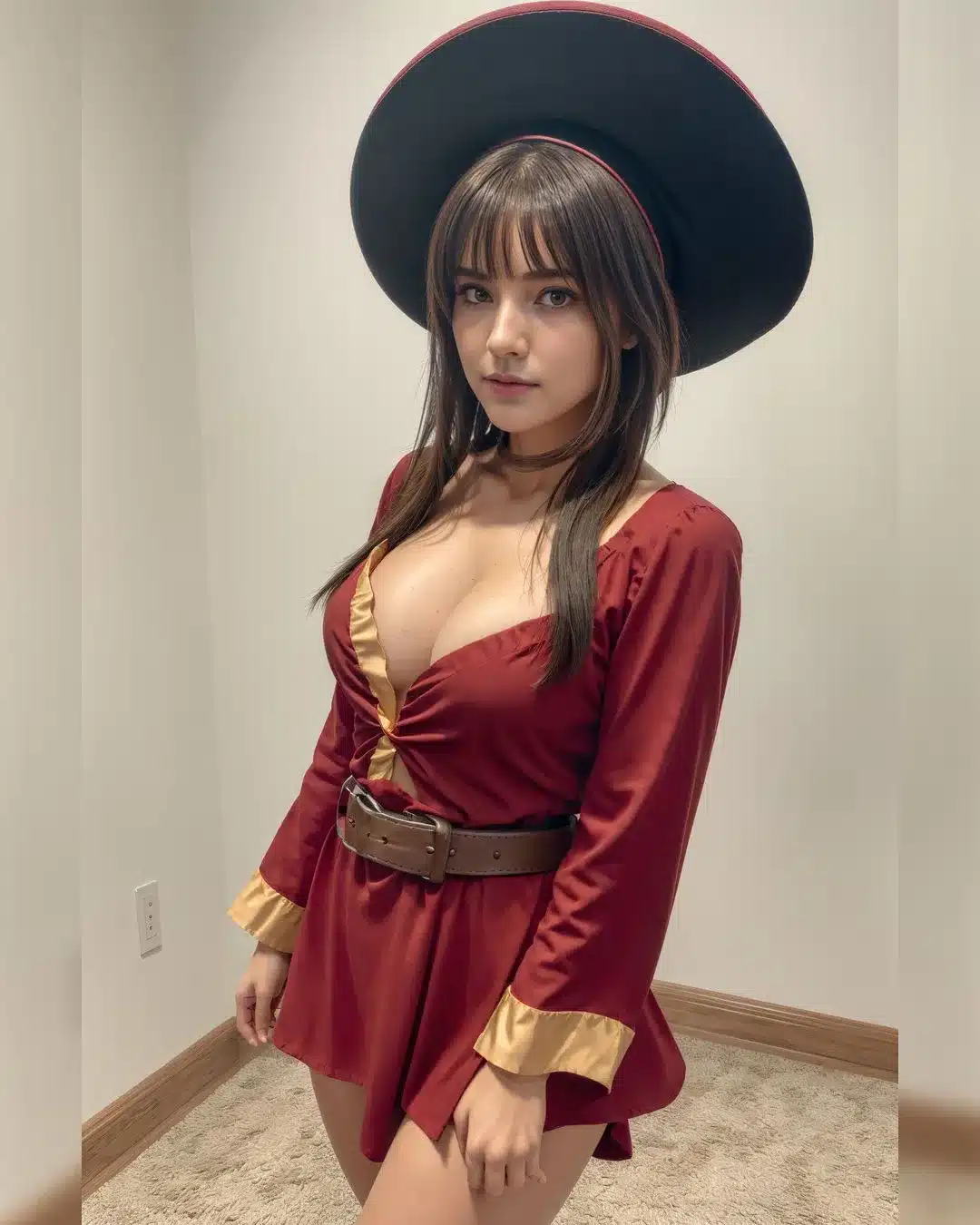 En las 3 imágenes posteriores Megumin de Konosuba es retratada ahora en un escenario interior donde se aprecian mejor los detallas de esta versión realista, pues ahora su vestido tiene una textura y brillos diferentes, mientras que las facciones físicas de su piel nos la dejan ver como una atractiva chica bronceada con unos cautivantes ojos cafés, una mirada misteriosa y un lindo y brillante cabello castaño. Sin duda una galería que nos muestra que Megumin sigue siendo tan popular como la primera vez que la conocimos.