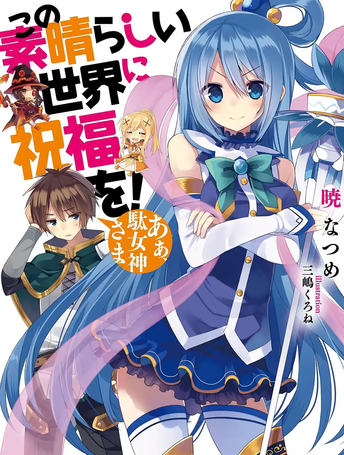 «Kono Subarashii Sekai ni Shukufuku wo!«, abreviado como «Konosuba!«, es una novela ligera de género isekai cuya autoría pertenece a Natsume Akatsuki, mientras que las ilustraciones son obra de Kurone Mishima. Esta fascinante novela ligera comenzó su publicación bajo el sello Kadokawa Sneaker Bunko de la editorial Kadokawa el 1 de octubre de 2013, y concluyó su emocionante trayecto el 1 de mayo de 2020. Durante este tiempo, la editorial Kadokawa publicó un total de 17 volúmenes, consolidando así la narrativa de este cautivador mundo.