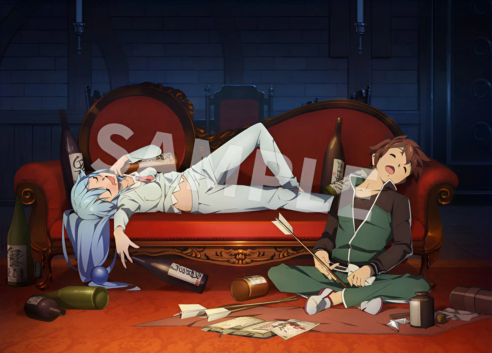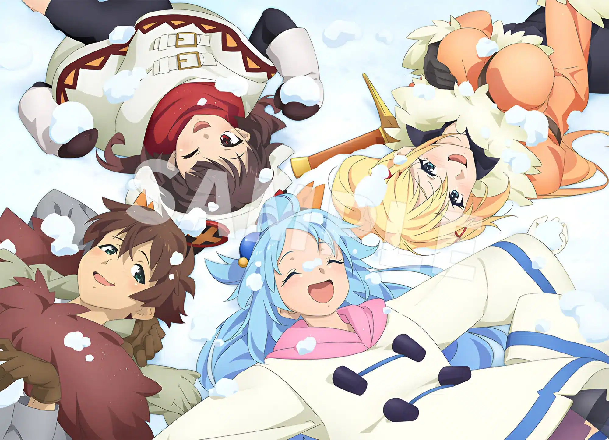 Es por eso que, para promocionar el próximo lanzamiento de este Blu-ray/DVD, el comité de producción de la serie ha compartido una serie de ilustraciones protagonizadas por los personajes Kazuma Satou, Aqua, Megumin, Darkness y Yunyun, en las que se les muestra en diferentes situaciones. Cabe señalar que dichas ilustraciones se utilizarán para crear diferentes productos que serán entregados como beneficio por la compra/reserva de este volumen Blu-Ray/DVD en algunas tiendas seleccionadas de Japón.