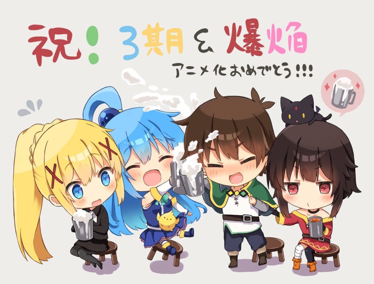Para celebrar el anuncio de la tercera temporada de la adaptaciรณn al anime de la novela ligera Konosuba!ย (Kono Subarashii Sekai ni Shukufuku wo!), reconocidos ilustradores y animadores han compartido hermosas ilustraciones de la franquicia.
