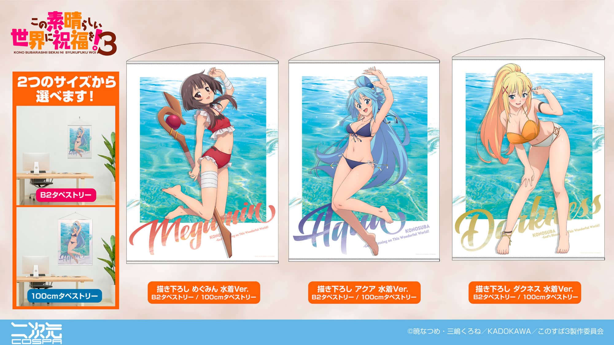 Adicionalmente, la compañia COSPA ha presentado una fascinante imagen promocional para esta colaboración con el anime Konosuba! y esta se destaca por presentar a las heroínas de la serie con unos atractivos trajes de baño que sacan a relucir toda su belleza. Además, cada traje de baño es diferente y se adaptan a la perfección a los atributos físicos de cada una de ellas.