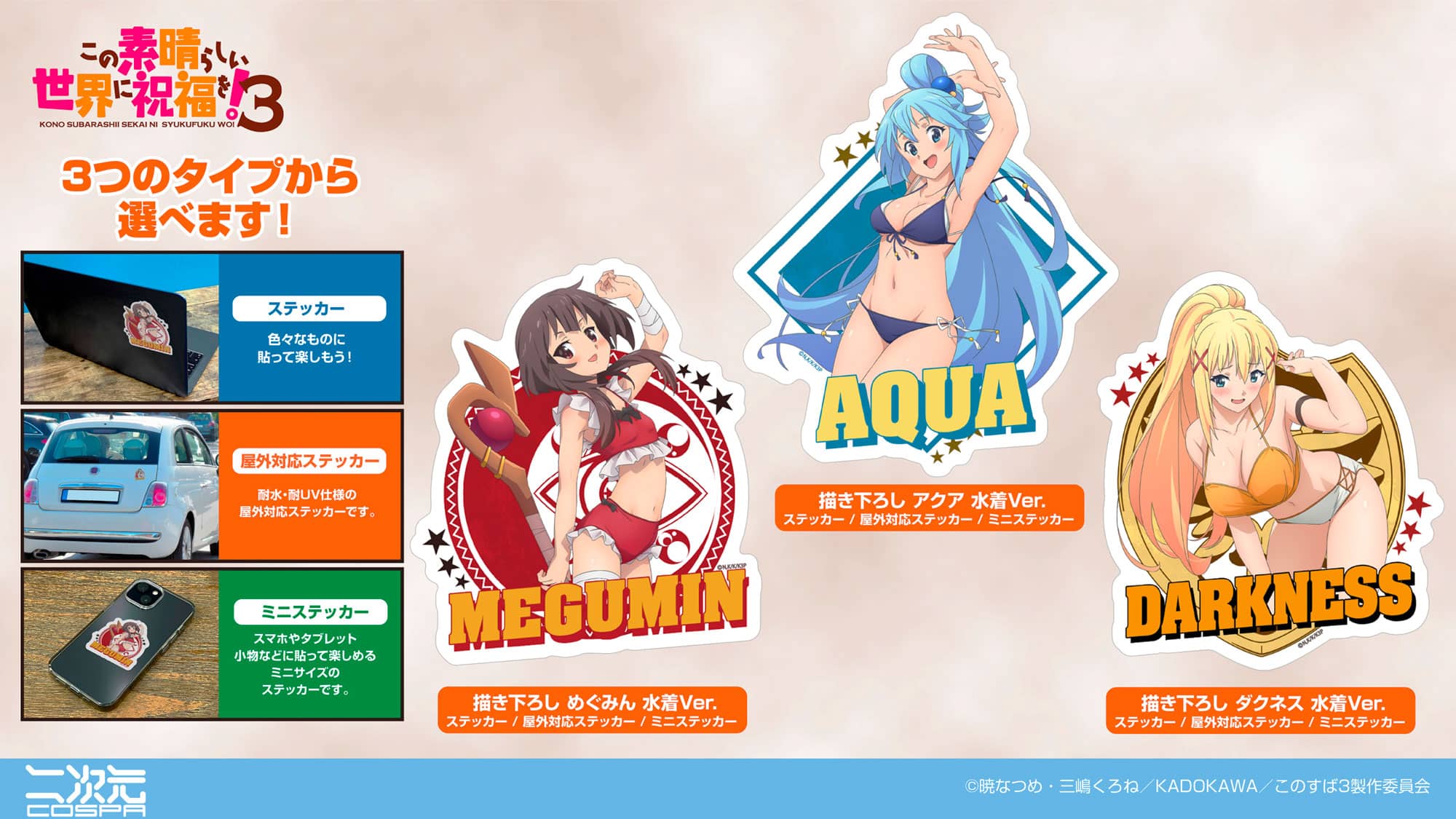 Como hemos mencionado con anterioridad, esta colaboración entre la compañia COSPA y el anime Konosuba! consistirá en la producción de geniales productos inspirados en Aqua, Megumin y Darkness. Algunos de los productos elegidos para la ocasión serán: Tela decorativa, Mini Pegatinas y Adhesivos.