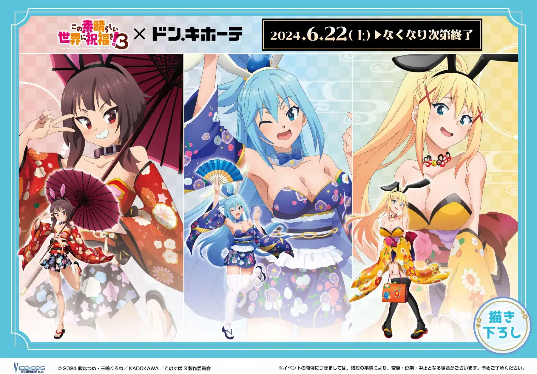 Esta colaboración entre el anime televisivo «KonoSuba: God’s Blessing on This Wonderful World!» y la compañia Don Quijote consistirá en la elaboración de una línea de productos que estarán inspirados en las protagonistas femeninas de la serie y se destacarán por presentar a estas waifus luciendo un atractivo Kimono que resaltará su belleza y también sus atributos físicos, además de incluir unas orejas de conejo en sus cabezas como un accesorio.