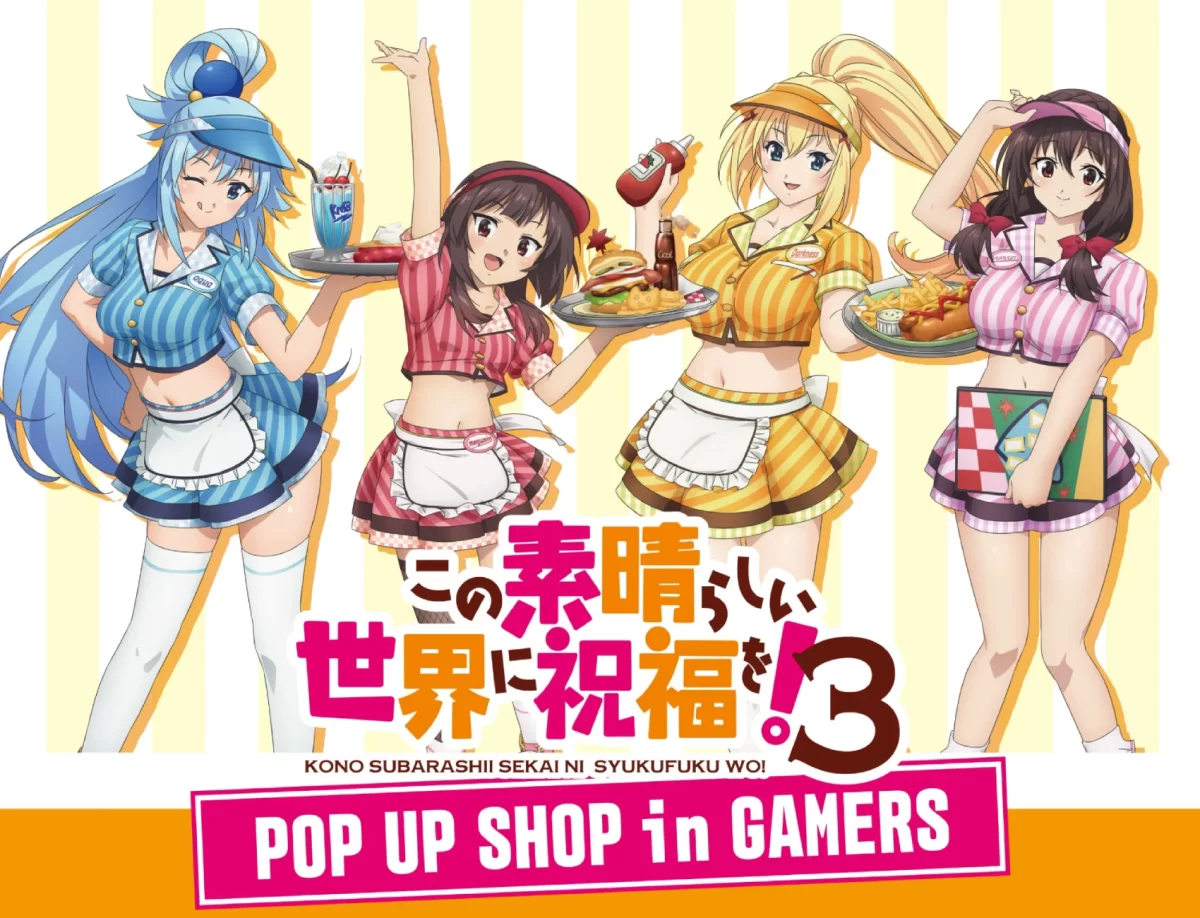 En los medios oficiales de la cadena de tiendas de Japón «Gamers» se ha presentado una interesante colaboración con la adaptación al anime de la novela ligera «KonoSuba: God’s blessing on this wonderful world!» (Kono Subarashii Sekai ni Shukufuku wo!) en conmemoración al próximo estreno de la tercera temporada de la serie.