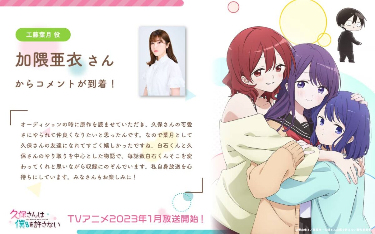 En el sitio web oficial para la adaptación al anime del manga Kubo-san wa Mobu wo Yurusanai (Kubo Won’t Let Me Be Invisible), se anunció a más miembros del elenco de voces y a la intérprete de su tema principal.