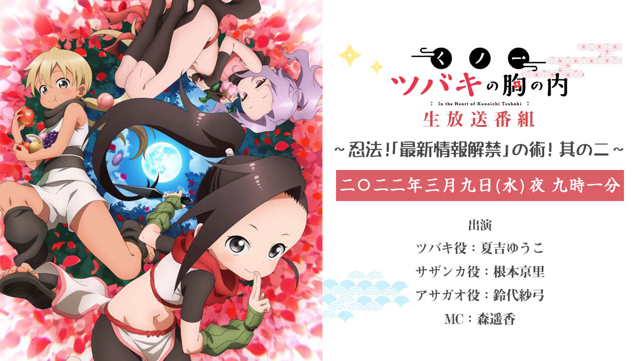 Según un reporte realizado por el comité de producción para la adaptación al anime del manga Kunoichi Tsubaki no Mune no Uchi (In the Heart of Kunoichi Tsubaki), se anunció que el próximo 9 de marzo se llevará a cabo una transmisión especial en donde se dará a conocer nuevos detalles sobre la serie.