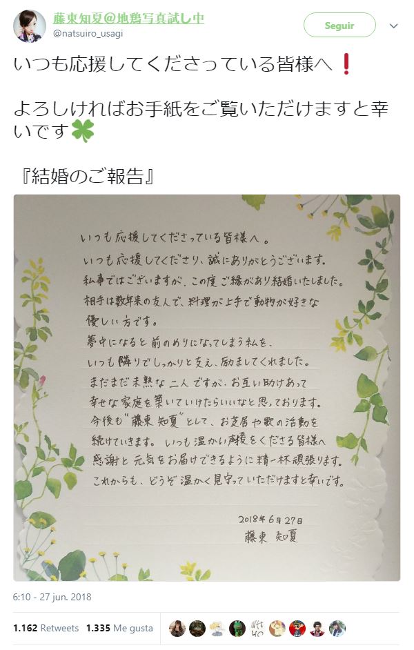 Dijo que se casó con alguien que ha sido su amigo durante varios años. Ella lo describió como «una persona amable que es buena para cocinar y le gustan los animales». Ella espera construir una familia feliz juntos mientras se apoyan mutuamente. Fujitō también agradeció a sus admiradores por su apoyo y confirmó que planea seguir trabajando en producciones dramáticas y cantando.