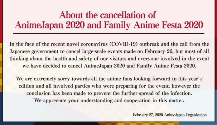 โAnte el reciente brote de coronavirus COVID-19) y el llamado del gobierno japonรฉs para cancelar eventos a gran escala realizados el 26 de febrero, pero sobre todo pensando en la salud y seguridad de nuestros visitantes y de todos los involucrados en el evento hemos decidido cancelar AnimeJapan 2020 y Family Anime Festa 2020.