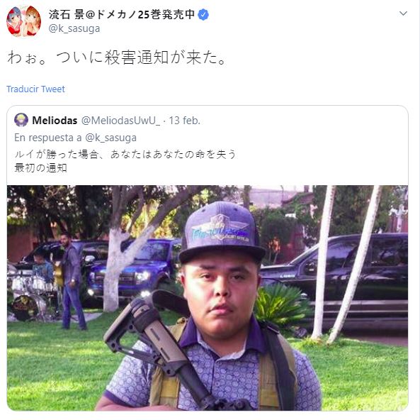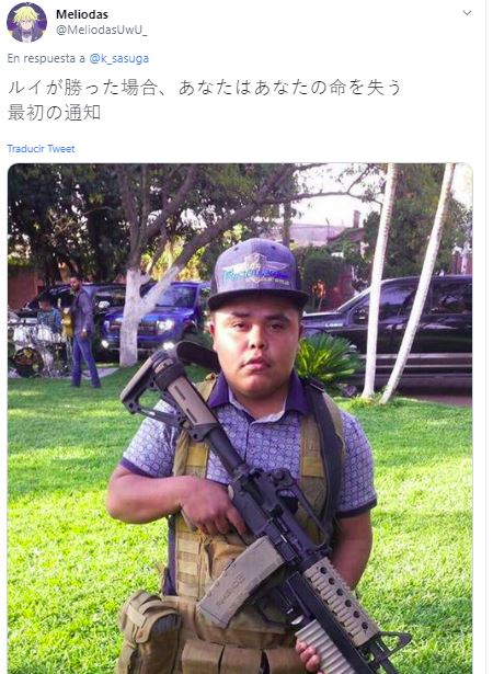 El usuario @MeliodasUwU_ comentรณ la publicaciรณn de la mangaka con una imagen del ย ยซEl Pirata de Culiacรกnยป portando un rifle y la siguiente amenaza: ยซEs el primer aviso, si Rui gana, perderรกs la vidaยป.