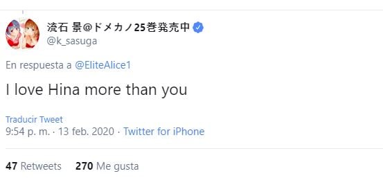 Keiย reaccionรณ al comentario de @MeliodasUwU_ y expresรณ: ยซWow, finalmente recibรญ una amenaza de muerteยป. Otro usuario le pregunto a la mangaka: ยซยฟPorque odias mucho a Hina?ยป; y Kei le respondiรณ que ella amaba mรกs a Hina que el.