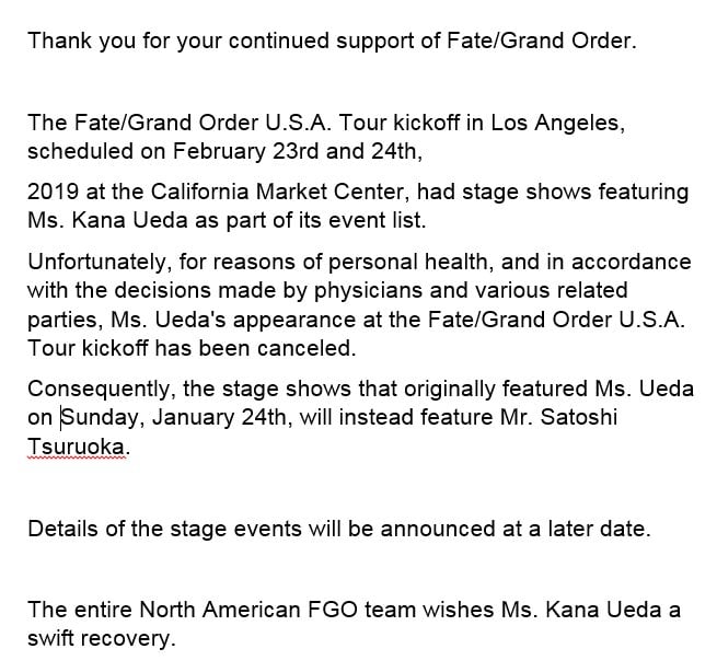 La cuenta de Twitter en inglés del videojuego Fate / Grand Order publicó una declaración el viernes sobre la salud de Ueda y la cancelación de su aparición en el evento.