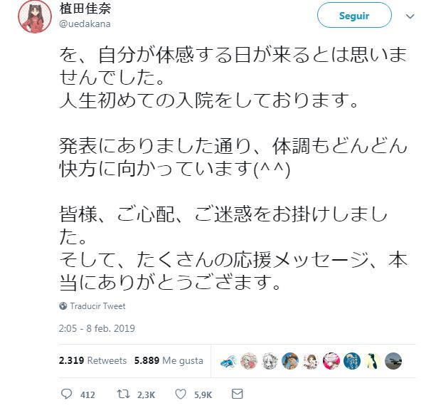La publicación señaló que la salud de Ueda ya estaba mejorando debido al tratamiento, pero a petición de su médico y otras personas relacionadas, ella decidió que no asistiría al evento Fate / Grand Order USA Tour 2019 en Los Ángeles a finales de este mes.
