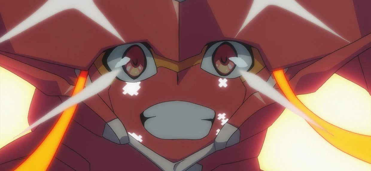 En el episodio 23 con tantas lucesitas de colores y batallas espaciales parecía que estábamos viendo Tengen Toppa, con sus paletas de colores. Luego llegó Strelizia Stin Apus, la Zero Two gigante con traje de novia y un cuerno y abriendo miles de lanzaderas de misiles que parecía uno acorazado de los barcos de la niebla de Arpeggio of Blue Steel (serie recomendada). Sin olvidar las lagrimas de la Zero Two gigante y demás sobradas. Eso si, la apariencia de Hiro con los cuernos y todos esos cables conectados a él era bien potente e imponente.