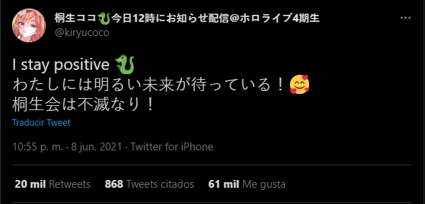Coco escribiรณ en su cuenta de Twitter que se mantendrรก positiva y que ยซKiryu Coco es inmortalยป.