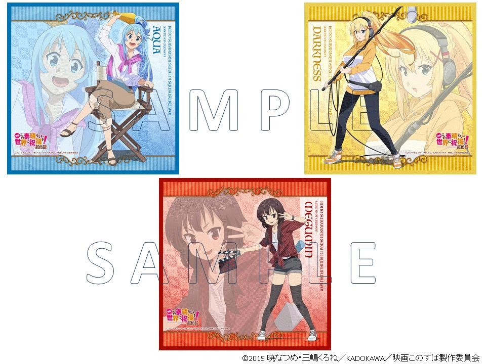 Mini Toalla de microfibra con ilustraciones de Megumi, Darkness y Aqua, cada uno por 540 yenes.