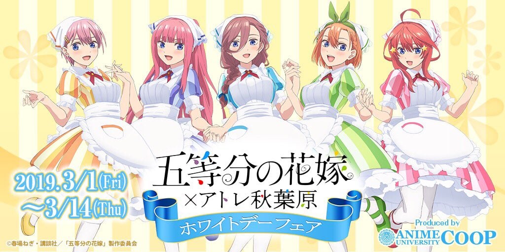 El anime Go-Toubun no Hanayome en una nuevo colaboración en con la tienda Atre ubicada en Akihabara, celebraran el día blanco y ofrecerán mercancía limitada desde 1 de marzo al 14 de marzo.
