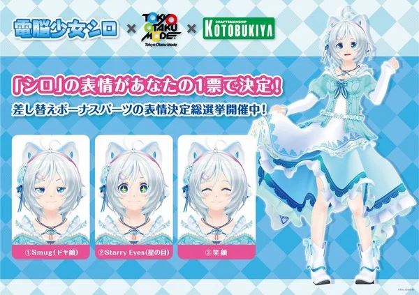 En el stand del minorista Kotobukiya se realizo una votación para decidir qué expresión tendría la figura de escala para Shiro. Hubo tres opciones para votar: Smirk, Starry Eyes y Smile.