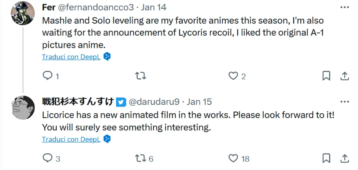 Hay que mencionar que este comentario realizado por Shunsuke Sugimoto fue eliminado con el paso de las horas. Sin embargo, los usuarios de Twitter pudieron tomar capturas antes de que esta respuesta fuera eliminada, lo que despertรณ la emociรณn de los fanรกticos de Lycoris Recoil, quienes han mostrado su entusiasmo por este comentario. Aunque aรบn no hay nada oficial, se han esparcido en internet actualizaciones sobre el proyecto animado de la serie.