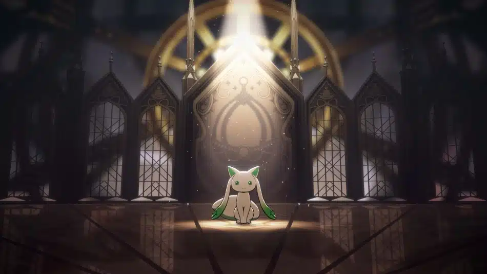 Posteriormente, el aura cambia dando paso a un efecto de estรกtica seguida de una serie de preguntas: โยฟQuiรฉn soy yo โฆ?โ, โยฟCรณmo he llegado aquรญ โฆ?โ. La acciรณn se interrumpe, la silueta desaparece, en su lugar vemos a un Kyubey con ciertas caracterรญsticas, sus orejas, ojos, y parte de su pelaje son tienen una tonalidad verde. La acciรณn la acompaรฑan otra serie de misteriosas oraciones para luego ver un primer primerรญsimo plano del sujeto en cuestiรณn, dando paso a un pequeรฑo collage de las diferentes producciones de la obra.