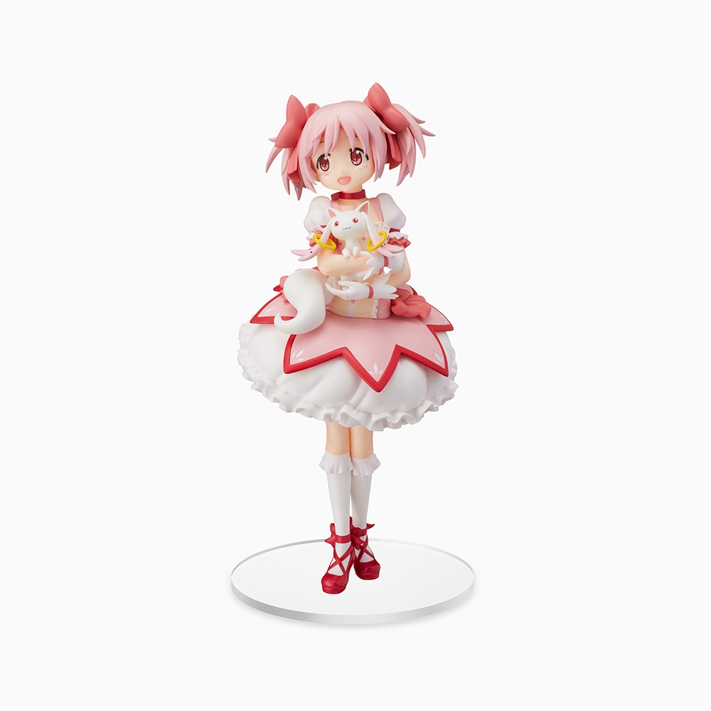 La figura nos muestra al personaje Madoka Kaname portando su vestido rosa mostrado en el anime. Cargando en brazos a Kywbey e inclinándose para adelante mostrando una pose bastante alegre del personaje. Los detalles de la ropa y de los accesorios son de admirar pues se puede observar la delicadeza que se tuvo al momento de la producción.