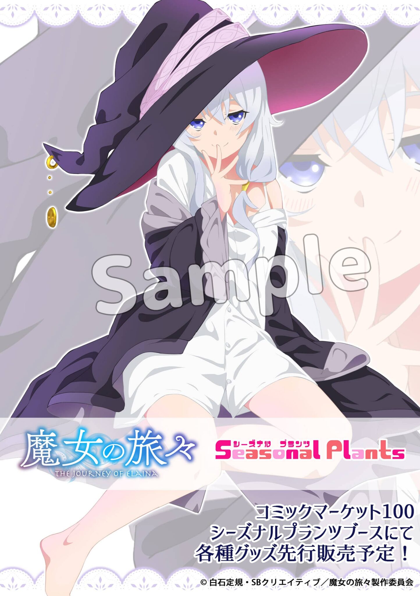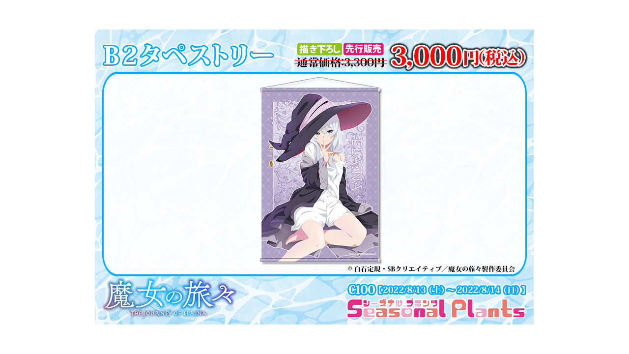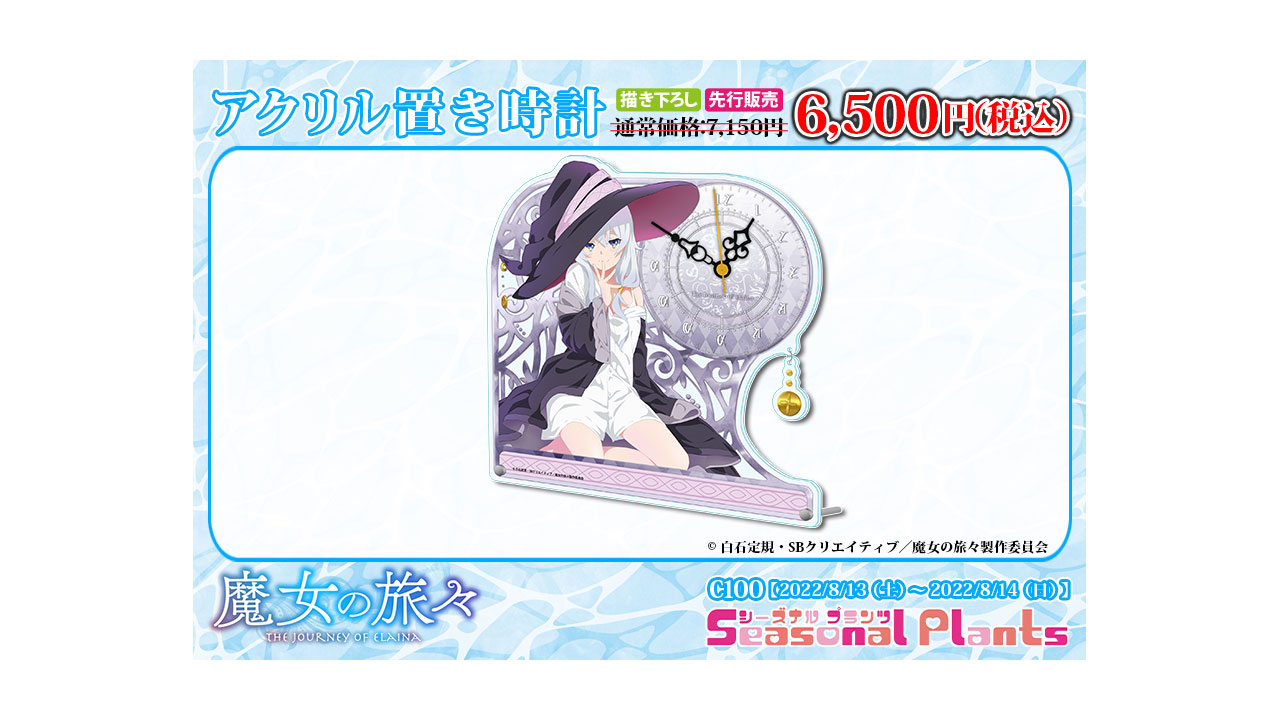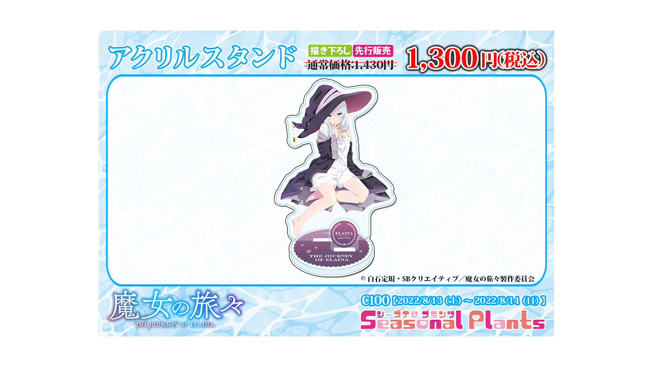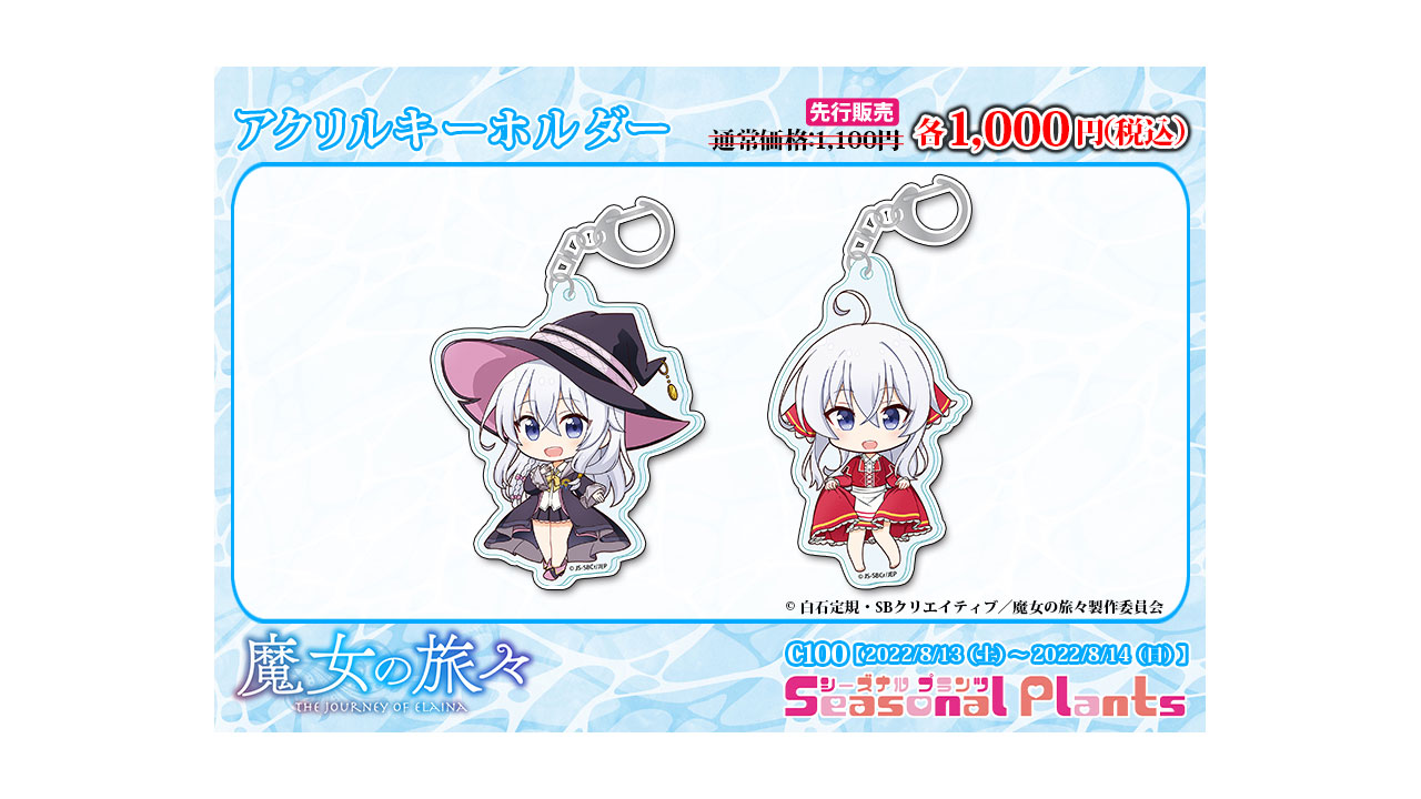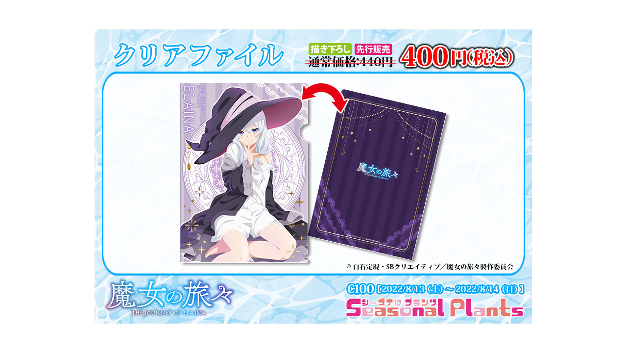 Cabe señalar que los productos de la colaboración entre la compañía Seasonal Plants y el anime Majo no Tabitabi se exhibirán en la Comic Market 100, el cual se realizará desde el 13 de agosto hasta el próximo 14 de agosto. Además, se han presentado diversos productos que estarán basados en la coqueta imagen visual de Elaina previamente mostrada.