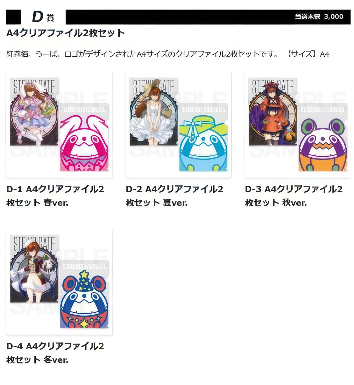 - Para los ganadores en la categorรญa ยซDยป el premio son unas tarjetas coleccionables de de Makise Kurisu con sus diferentes atuendos