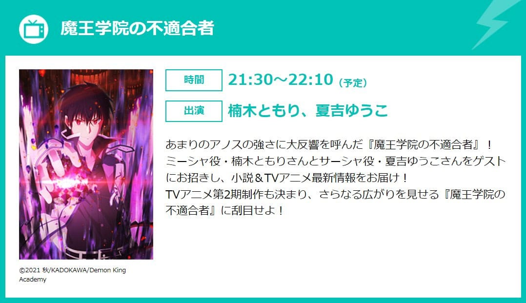 En el sitio web oficial del sello editorial Dengeki Bunko se anunció que en el evento «Dengeki Bunko Winter Festival Online 2021» el anime Maou Gakuin no Futekigousha (The Misfit of Demon King Academy) dará a conocer nueva información sobre su segunda temporada.