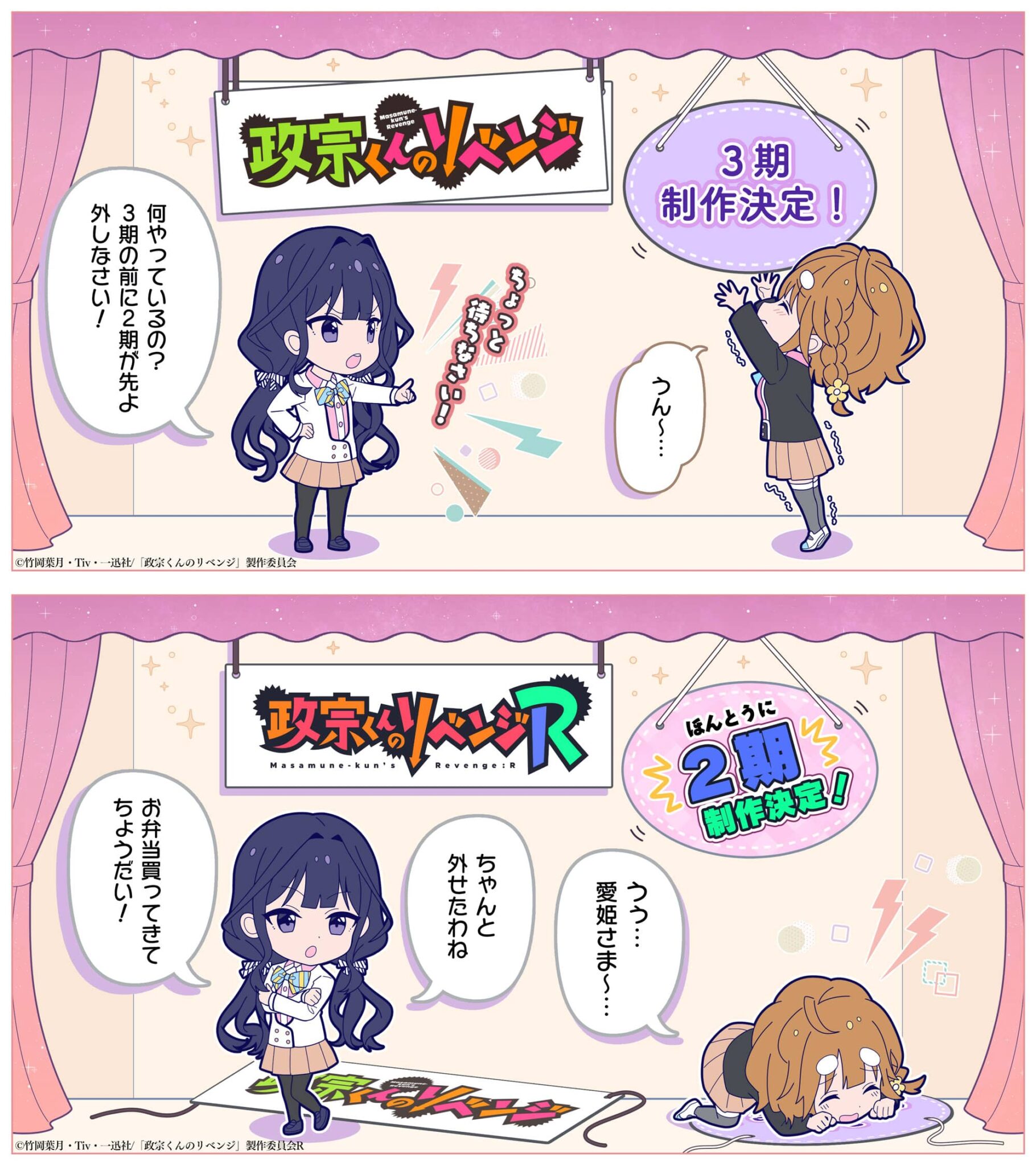 El 1 de abril (2 de abril en Japón), el anime Masamune-kun no Revenge anunció la producción de su segunda temporada que se titulará «Masamune-kun no Revenge R«, sin embargo, aún no se han dado muchos detalles sobre esta nueva temporada, pero se espera a que nueva información se revele en el futuro.
