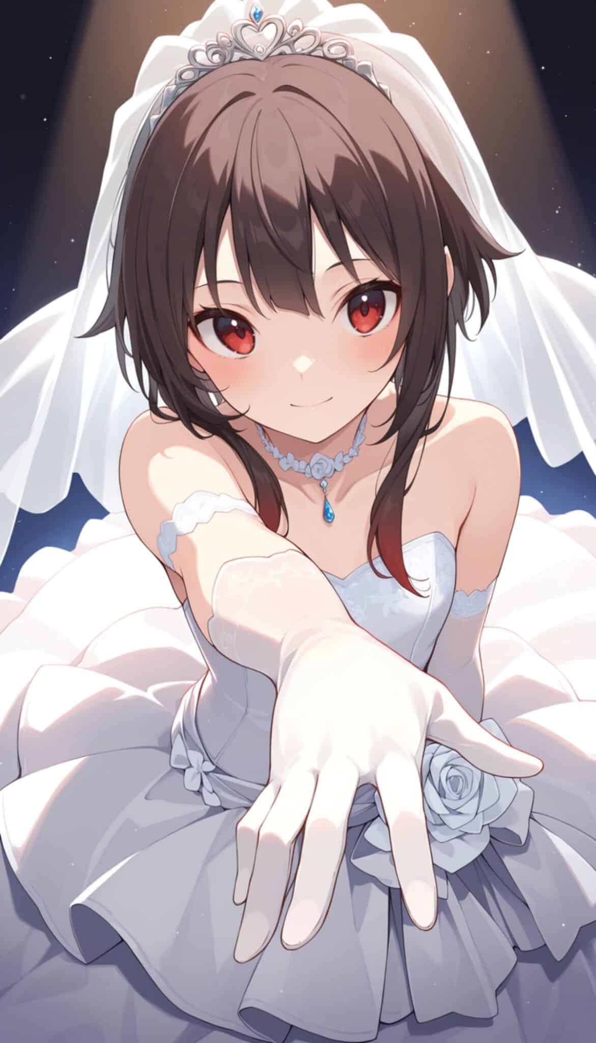 Megumin se encuentra utilizando este largo vestido en color blanco, acompañado de accesorios como unos guantes y su diadema en la cabeza. Además, justamente en una de las imágenes está realizando una pose que da a entender que está estirando la mano para que se le coloque el anillo, completando así una perfecta representación.
